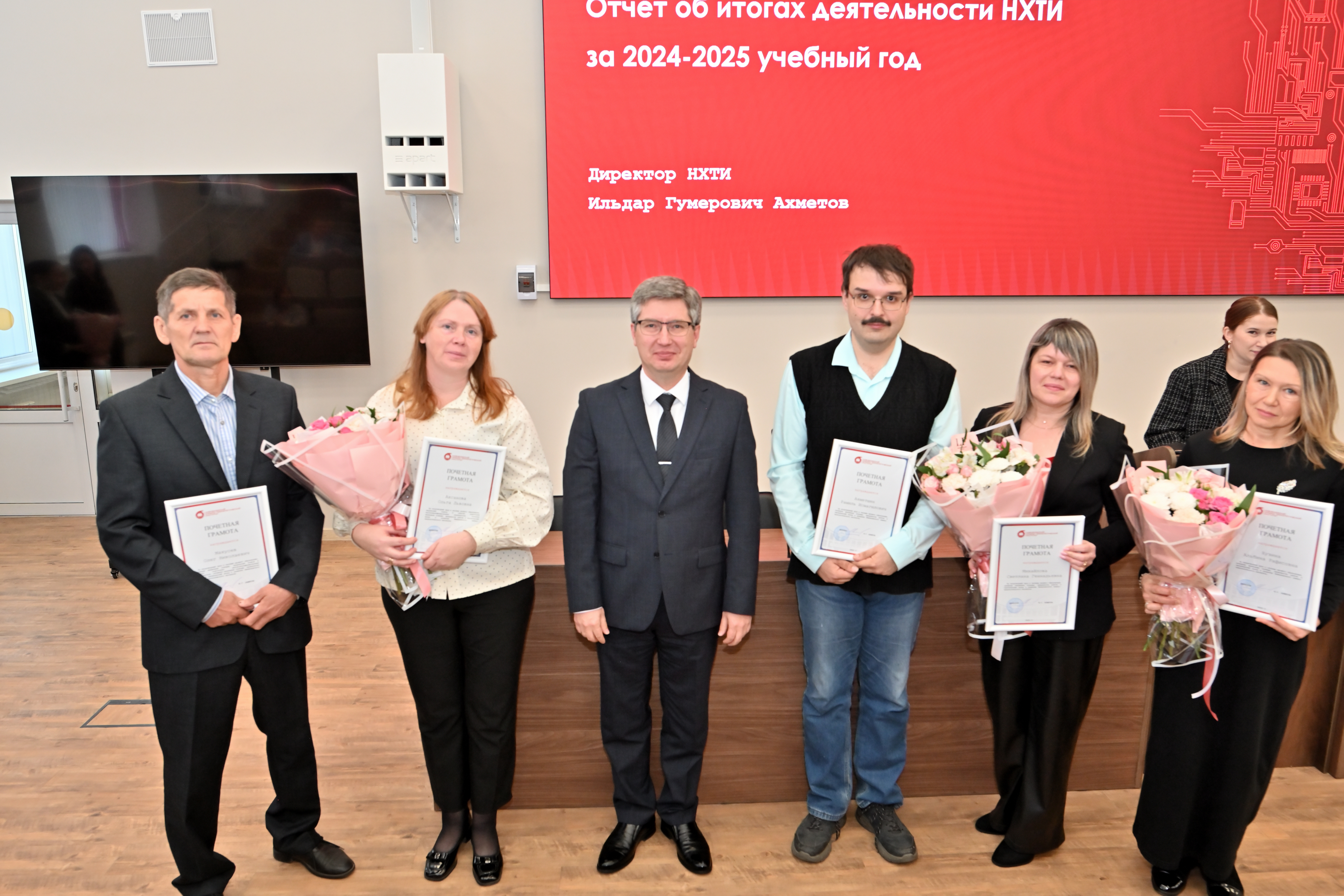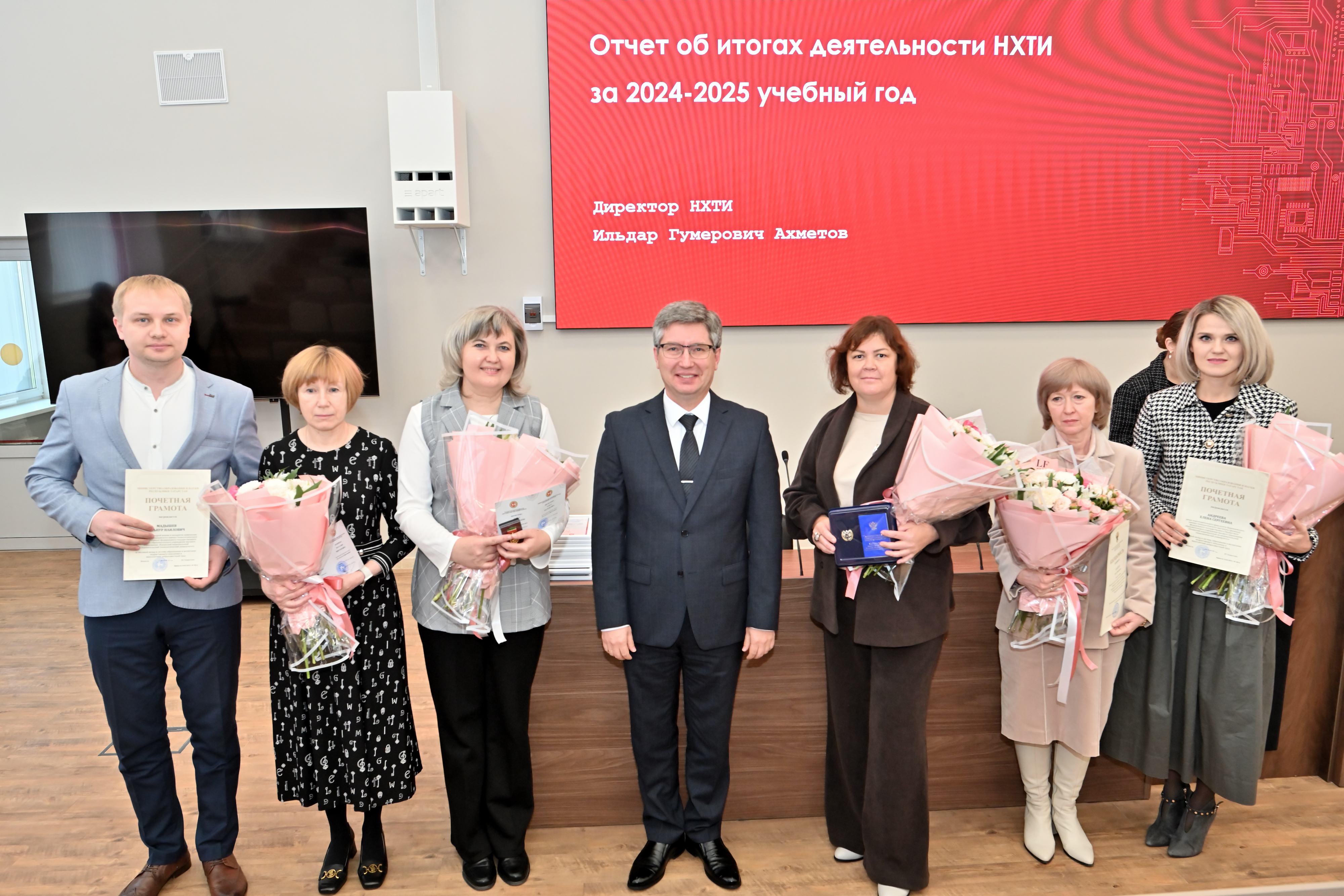 Заседание началось с торжественной церемонии: наградами различного уровня были отмечены сотрудники и преподаватели института, о чем Ильдар Ахметов также отметил в своем докладе.
